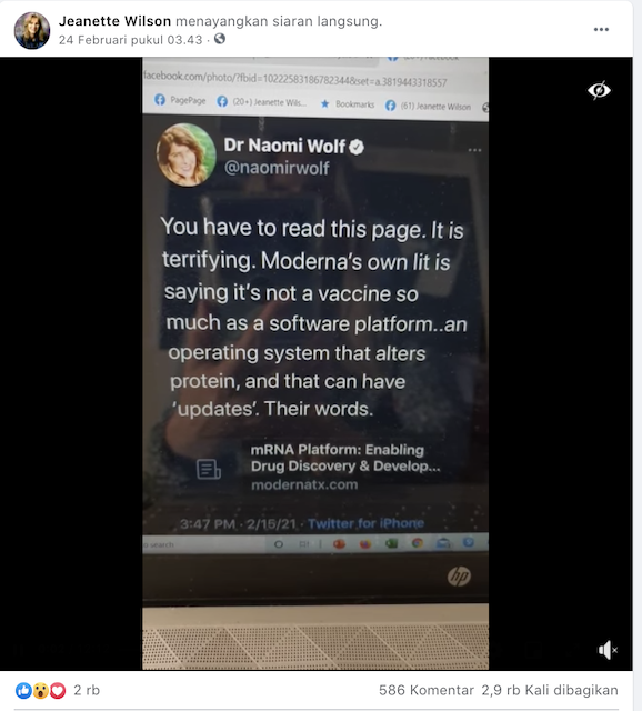 Akun Facebook Jeanette Wilson membagikan video itu pada Rabu, 24 Februari 2021. Dalam video itu, terdengar suara seorang wanita membahas isi sebuah artikel yang diunggah akun Twitter @naomirwolf. Artikel tersebut berisi penjelasan mengenai penemuan dan pengembangan vaksin Moderna untuk melawan virus.
