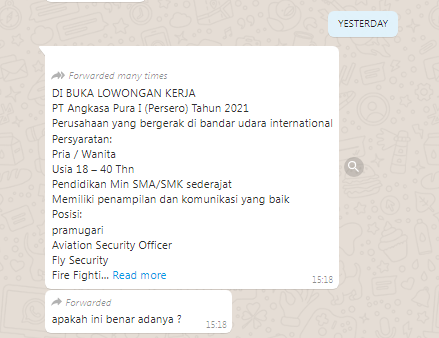 Dari penelusuran kami, klaim bahwa lowongan itu resmi dari PT AP 1, adalah salah. Faktanya, ini hoaks yang kerap beredar di tengah masyarakat dengan sedikit modifikasi.