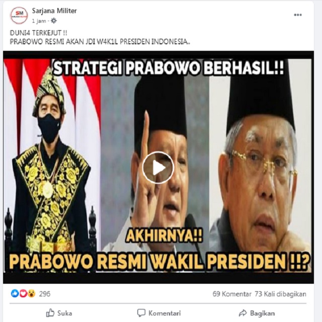 Klaim bahwa Menteri Pertahanan Prabowo Subianto resmi akan menjadi Wakil Presiden, adalah salah. Faktanya, tidak ada informasi valid mengenai hal tersebut.