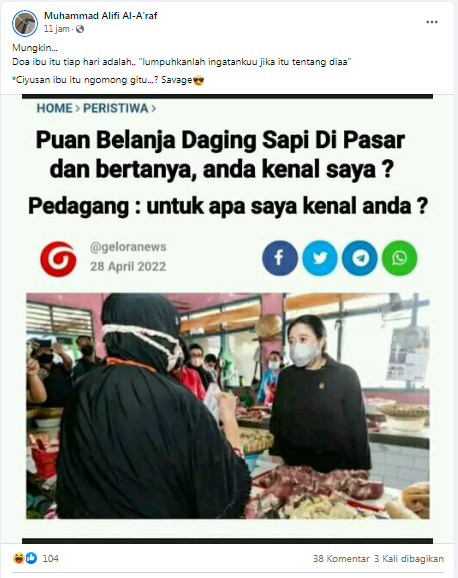 Narasi pada foto itu sebenarnya adalah "Puan Belanja Daging Sapi di Pasar, Pedagang: Siapa Namanya, Nggak Tahu...". Foto itu merupakan tangkapan layar artikel Geloranews yang dimuat pada 28 April 2022.