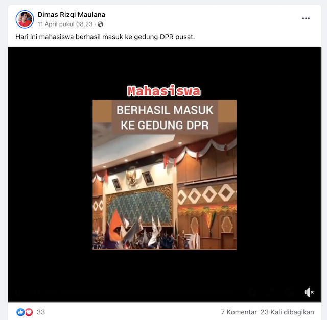 Akun Facebook Dimas Rizqi Maulana membagikan video itu pada Senin, 11 April 2022. Pada video terdapat narasi "Mahasiswa BERHASIL MASUK KE GEDUNG DPR".