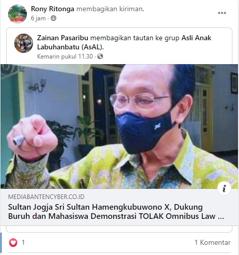 Tautan artikel berita tersebut berjudul "Sultan Jogja Sri Sultan Hamengkubuwono X, Dukung Buruh dan Mahasiswa Demonstrasi TOLAK Omnibus Law". Artikel dimuat di situs mediabantencyber.co.id.