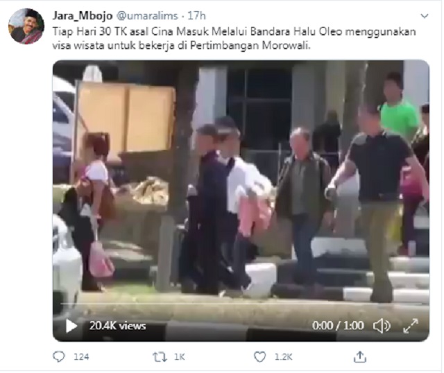 "Tiap Hari 30 TK asal Cina Masuk Melalui Bandara Halu Oleo menggunakan visa wisata untuk bekerja di Pertimbangan Morowali," tulis akun twitter Jara_Mbojo @umaralims, Sabtu 9 Mei 2020.
