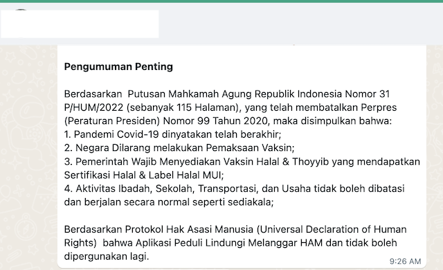 "Pengumuman Penting Berdasarkan Putusan Mahkamah Agung Republik Indonesia Nomor 31 P/HUM/2022 (sebanyak 115 Halaman), yang telah membatalkan Perpres (Peraturan Presiden) Nomor 99 Tahun 2020, maka disimpulkan bahwa: