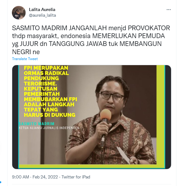 Klaim bahwa Ketua Umum Aliansi Jurnalis Independen (AJI), Sasmito Madrim menjadi provokator karena mendukung pembubaran FPI, adalah salah. Faktanya, pihak AJI telah memberikan klarifikasi.