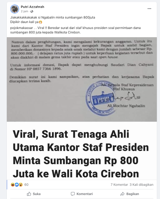 Beredar sebuah foto memperlihatkan surat dengan narasi bahwa Tenaga Ahli Utama Kantor Staf Presiden Ali Mochtar Ngabalin meminta sumbangan Rp800 juta kepada Wali Kota Cirebon. Foto surat ini beredar di media sosial.