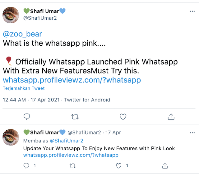 Akun Twitter @ShafiUmar2 turut menyebarkan link tersebut pada 17 April 2021. Disebutkan, WhatsApp baru saja merilis versi terbaru dengan tampilan tatap muka berwarna merah muda atau pink.