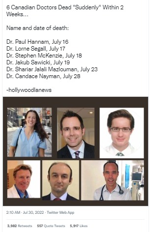 "6 Dokter Kanada Meninggal "Tiba-tiba" Dalam 2 Minggu... Nama dan tanggal kematian: Dr. Paul Hannam, 16 Juli Dr. Lorne Segall, 17 Juli Dr. Stephen McKenzie, 18 Juli Dr. Jakub Sawicki, 19 Juli Dr. Shariar Jalali Mazlouman, 23 Juli Dr. Candace Nayman, 28 Juli -hollywoodlanews."