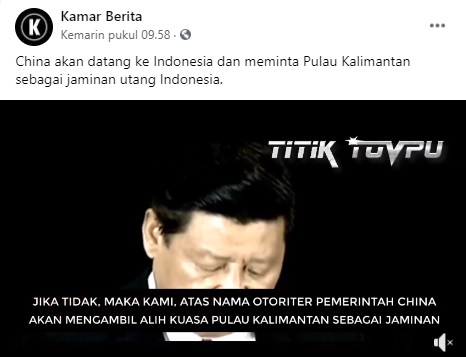 Klaim video Xi Jinping minta Pulau Kalimantan sebagai jaminan utang adalah salah. Faktanya, video Xi Jinping tersebut adalah momen saat kunjungan ke Indonesia pada Oktober 2013 lalu di masa pemerintahan Presiden Susilo Bambang Yudhoyono (SBY).
