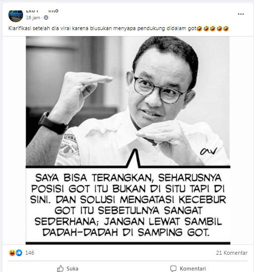 Adalah akun facebook EH yang turut mengunggah meme tersebut, Senin 13 September 2021. Akun itu menegaskan bahwa meme itu merupakan klarifikasi Anies terkait peristiwa kecebur got.