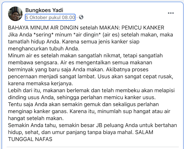 Klaim bahwa meminum air dingin setelah makan menyebabkan kanker adalah salah. Faktanya, klaim ini telah dibantah ahli.