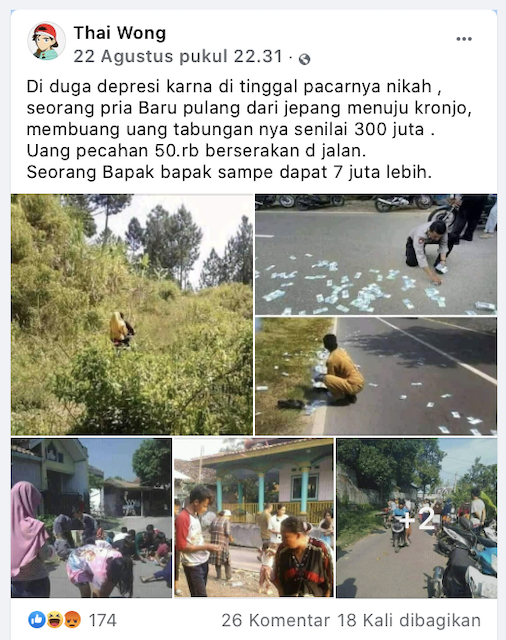Beredar beberapa foto yang memperlihatkan sejumlah uang kertas berserakan di jalan raya. Pada salah satu foto, terlihat seorang polisi memungut uang yang berserakan. Diklaim, uang-uang tersebut dihamburkan seorang pria yang diduga depresi karena ditinggal kekasihnya menikah.