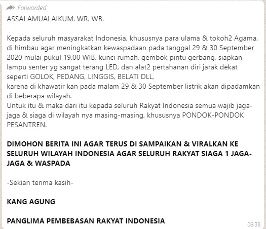 di himbau agar meningkatkan kewaspadaan pada tanggal 29 & 30 September 2020 mulai pukul 19.00 WIB, kunci rumah, gembok pintu gerbang, siapkan lampu senter yg sangat terang LED, dan alat2 pertahanan diri jarak dekat seperti GOLOK, PEDANG, LINGGIS, BELATI DLL,