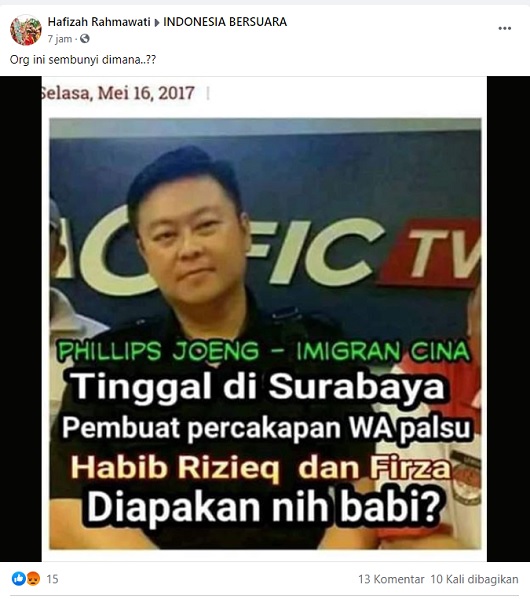 Dari hasil penelusuran kami, klaim bahwa Phillips Joeng imigran asal Tiongkok yang menyebarkan percakapan palsu Habib Rizieq adalah salah. Faktanya, pria tersebut adalah warga Surabaya yang akun media sosialnya dicatut sebagai penyebar percakapan palsu Habib Rizieq.