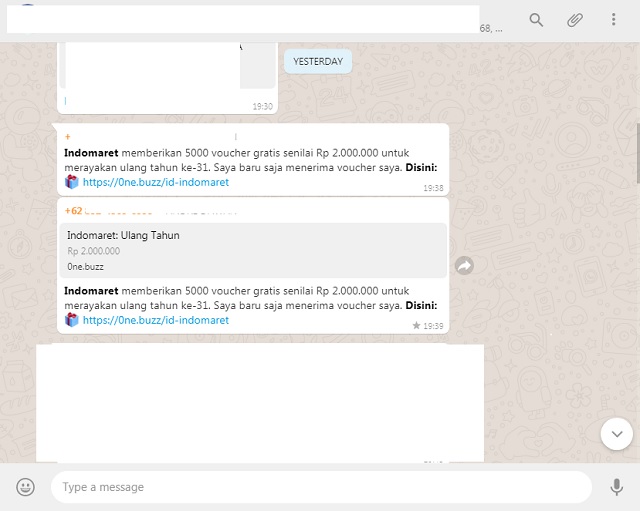 "Indomaret memberikan 5000 voucher gratis senilai Rp 2.000.000 untuk merayakan ulang tahun ke-31. Saya baru saja menerima voucher saya. Disini: