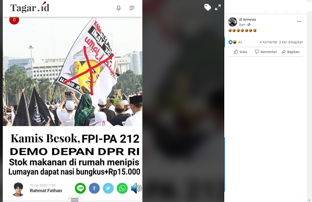 Adalah akun facebook JE Almeida yang mengunggah sebuah tangkapan layar berisi narasi tersebut, Rabu 15 Juli 2020. Tangkapan layar itu berisi judul artikel dari situs Tagar.id yang dimuat pada Rabu 15 Juli 2020 pukul 01.30 WIB.