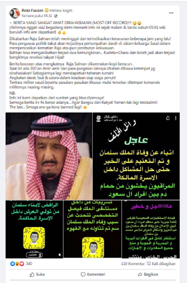 Adalah akun facebook Reza Fauzan yang mengunggah narasi ini, Selasa 21 Juli 2020. Akun ini mengklaim kabar wafatnya Raja Salman dari sumber yang bisa dipercaya.