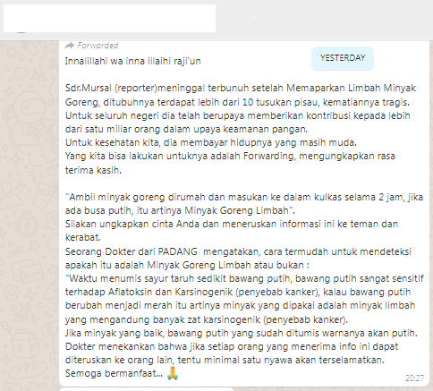 Yang kita bisa lakukan untuknya adalah Forwarding, mengungkapkan rasa terima kasih. "Ambil minyak goreng dirumah dan masukan ke dalam kulkas selama 2 jam, jika ada busa putih, itu artinya Minyak Goreng Limbah".
