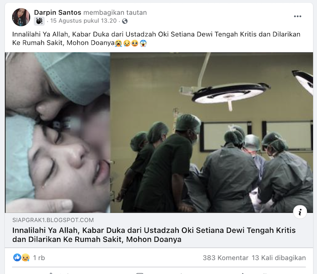 Akun Facebook Darpin Santos membagikan kabar itu pada Minggu, 15 Agustus 2021. Pada unggahannya, akun itu mengunggah artikel dari situs blog yang menarasikan bahwa Oki kritis disertai gambar sampul suasana operasi di rumah sakit.